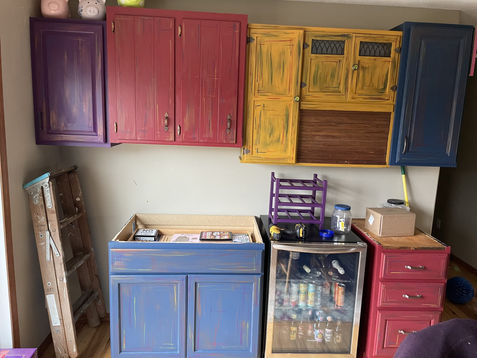 Once I got a few coats on all the cabinets I felt much better. It was definitely not going to be Viking themed. I decided I needed to be a little artsy with it so I on the purple cabinet I added some fun accents of yellow, blue and red and the blue cabinet got accents of yellow, purple and red, etc. I did have some metallic painted that I added as well – just because I could.
