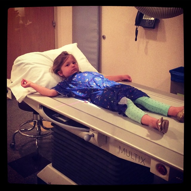 The doctor recommended a quick x-ray just to check on the location of the penny. She’s totally fine at the point but I have to say it’s really sad seeing your baby in a hospital gown!
