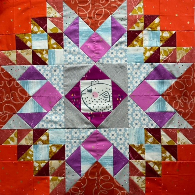 A panel is included in the Birthday Fat Quarter Bundle by Sarah Watts for Ruby Star Society and I thought it would be fun to fussy cut out some of the creatures for the center of the star. This won’t work for every block but I hope to add bits of the panel in as I can throughout this quilt. I just love the bit of whimsy it adds.