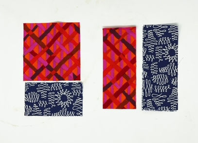 Sew a 2″ x 5″ rectangle of Fabric C and sew it to a 2″ x 5″ rectangle of Fabric B. Press towards Fabric C. Make 2.