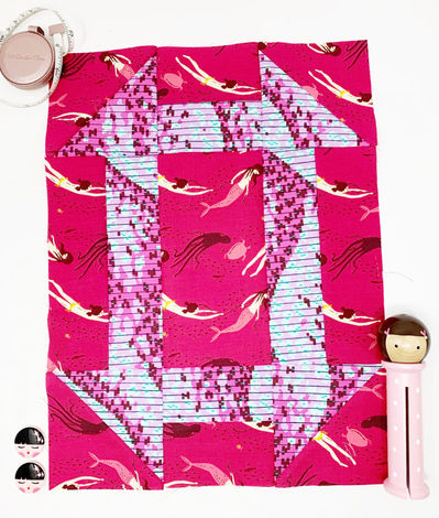 Fabric C (mermaids): (2) 5.0″ squares (2) 2.5″ x 4.5″ rectangles (2) 2.5″ x 8.5″ rectangles (1) 4.5″ x 8.5″ rectangle