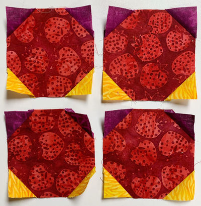 On two Fabric 4a squares and two Fabric 6 squares draw a diagonal line on the wrong side of the fabric. Place the squares right sides together onto the corners of a Fabric 2 square.