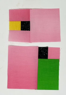 Sew the upper left three pieces together. Press towards Fabric A. Sew the lower right two pieces together. Press towards Fabric C.