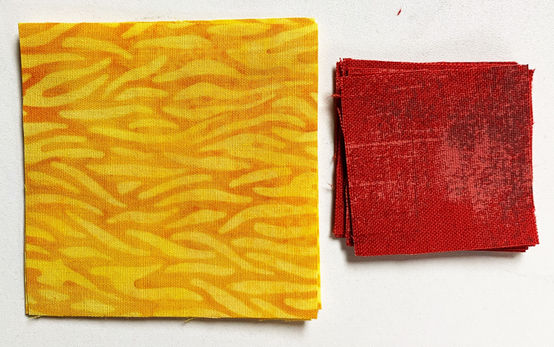 On two Fabric 3 squares draw a diagonal line on the wrong side of the fabric. Place a Fabric 3 square in the upper right of a Fabric 6 square as shown in the picture above.
