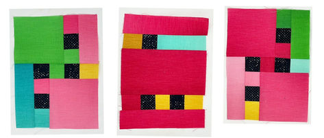 Sew the 1.5″ square strips to the adjacent fabric sections as shown. Press towards the solid fabrics.