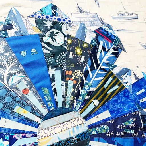 One thing I did to add a little extra fun to this piece was making my own fabrics out of 1-inch blue strips to use for the roofs and the center circle. It might have created a bit more busier look than I needed since this is already all one color, but that’s pretty much my style anyway so I’m just going to own it.
