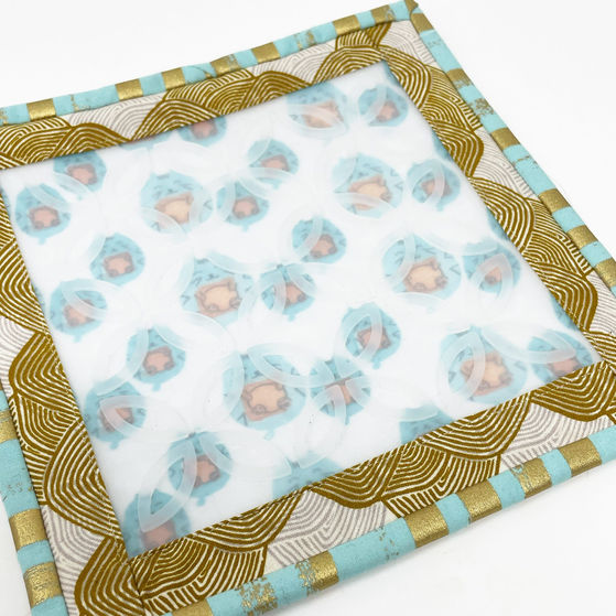 This particular trivet features a cat print that my daughter created and I had printed on spoonflower. The Double Stamp Cat fabric is visible through the silicone and then Single Stamp Cat fabric is featured on the back.