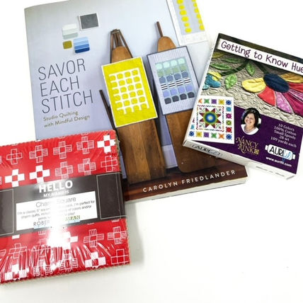 I’ve decided to add to the prize batches each week! There are already TONS of prizes but with the record number of weekly participants I thought it wouldn’t hurt to add another one in! This prize includes everything in the picture – a copy of the book “Savor Each Stitch” by Carolyn Friedlander, an Aurifil Small Spool Collection – Getting to Know Hue, and HELLO My Name is Charm Square pack.