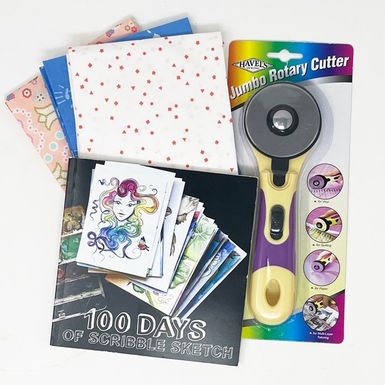 Persimon Dreams – a random bunch of goodies from me including fat quarters, a super fun 100 Days of Scribble Sketch by my friend and artist Christy Grace, and a Jumbo Rotary Cutter.