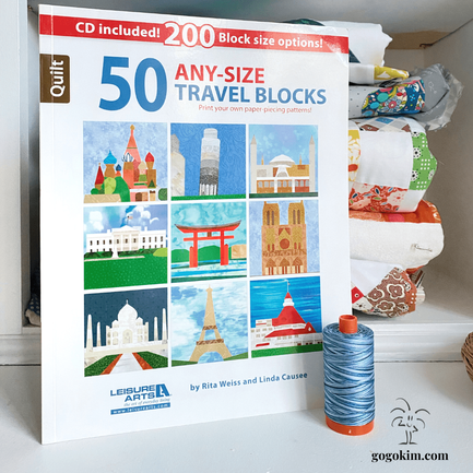 The fabulous Go-Go Kim is giving one lucky participant – 27. Meena Schaldenbrand – a copy of this fantastic book “50 Any-Size Travel Blocks” from Leisure Arts and a spool of Aurifil thread!